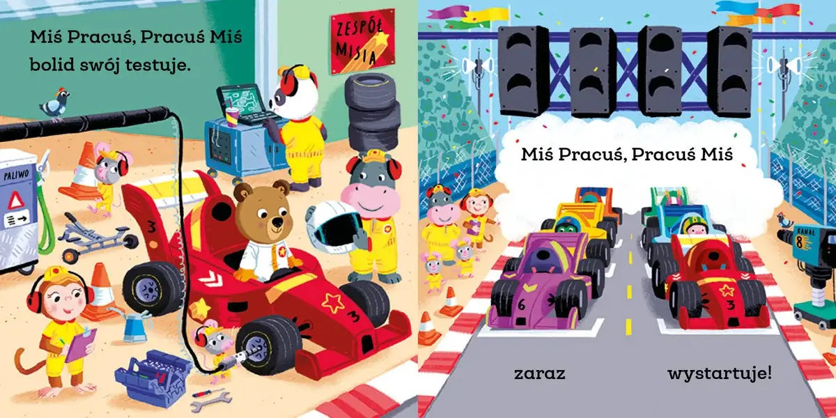 Miś pracuś. Kierowca rajdowy to grubokartonowa książeczka z ruchomymi elementami. Ulubiona seria dzieci od Wydawnictwa Wilga. Książeczki napisane są prostym i rymowanym tekstem.