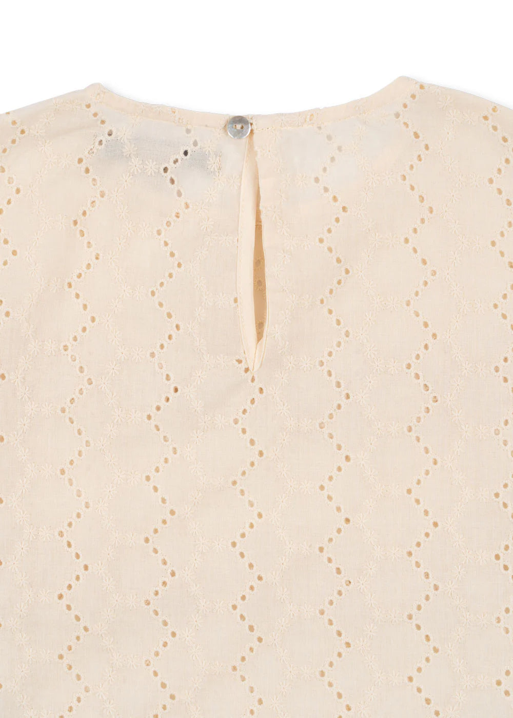 Piękna delikatna, na wyjątkowe okazje i nie tylko. Wykonana z miękkiej bawełnianej tkaniny z ażurami i z delikatnym angielskim haftem i falbankami. Sukienka ma elastyczne mankiety. Z tyłu zapinana na jeden guzik.