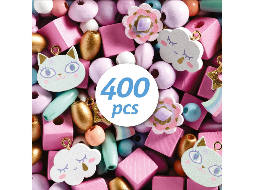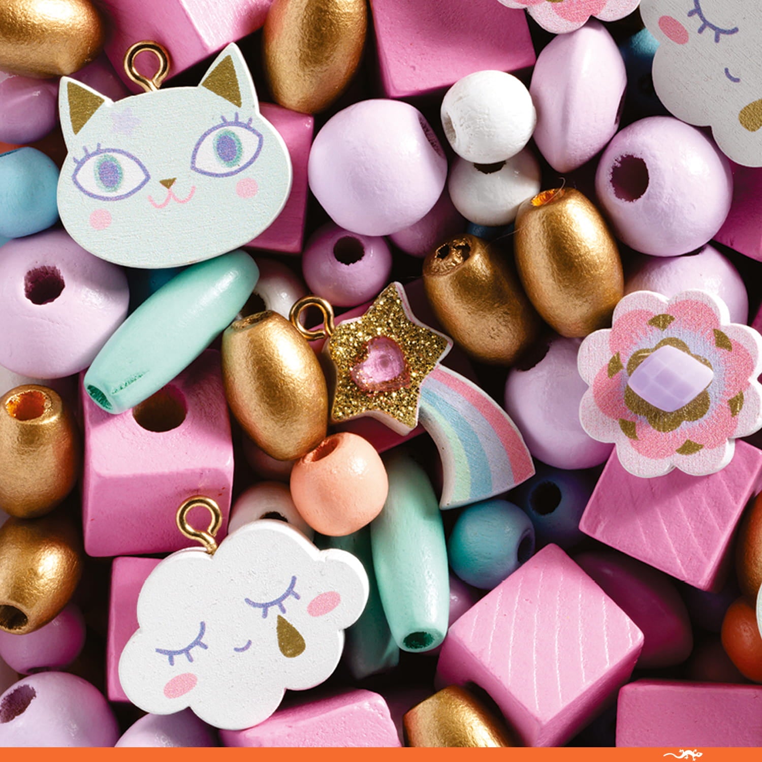 Zestaw do tworzenia biżuterii z drewnianych koralików z motywem tęczy i kotka.